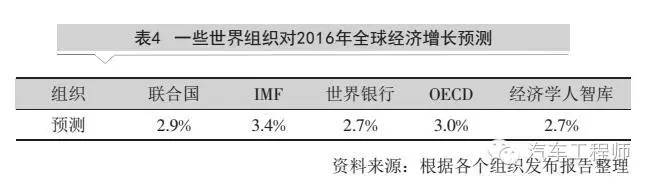 综合这些因素,全球汽车市场将继续保持微弱增长态势,一些预测机构对2016年增长率的预测也大致保持在2.5%~3%之间:杜伊斯堡-埃森大学汽车研究所认为在低油价的刺激下,2016年全球小汽车新车销量将额外增加60万辆,整体比2015年增长2.5%;标准普尔预计2016年全球汽车销售量将增长3%左右; 《经济学人》 预计2016年全球汽车市场销量将增长3.1%左右。
